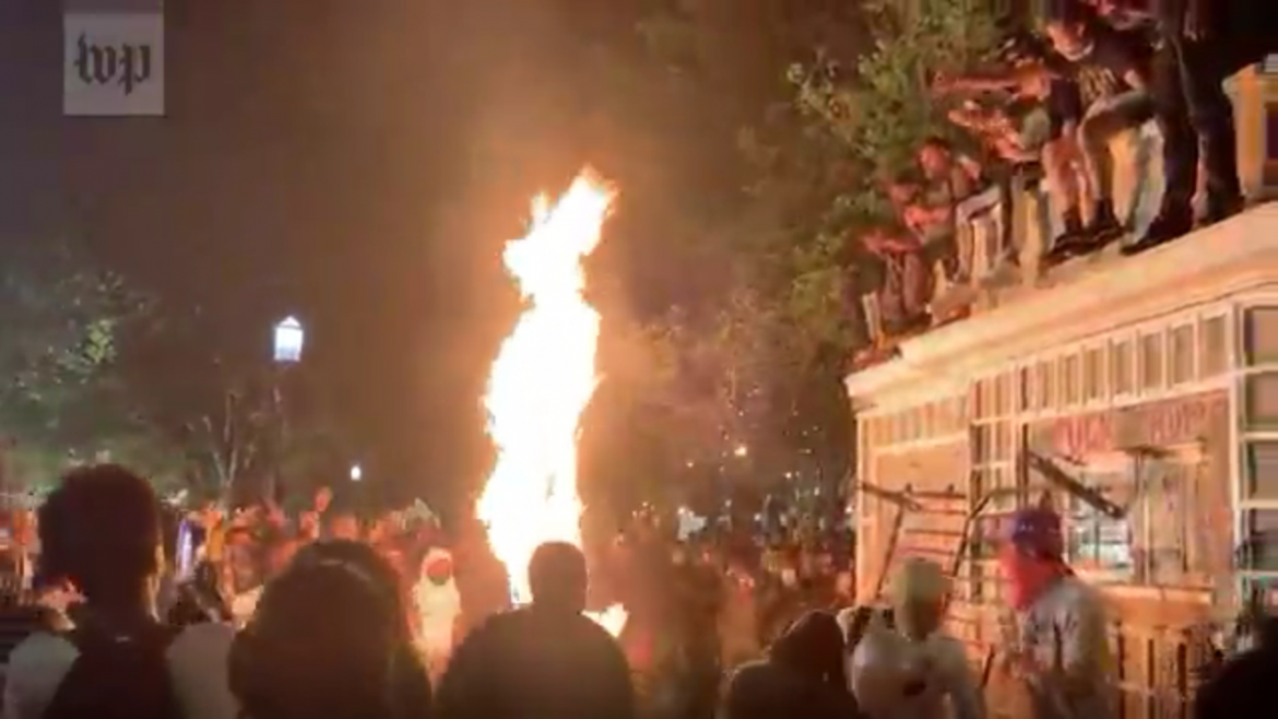 More than 1,000 people marched to Lafayette Square across from the White House, and at night fall American flags and parked cars and buildings were lit ablaze. The historic Episcopal Church of St. John, were set on fire during the clashes. The historic landmark opened in 1816 and attended by every president since James Madison.